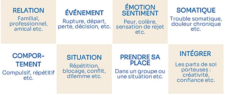 En rdv individuel ou en session de groupe, une séance propose de visiter une situation personnelle problématique, contraignante ou questionnante.
